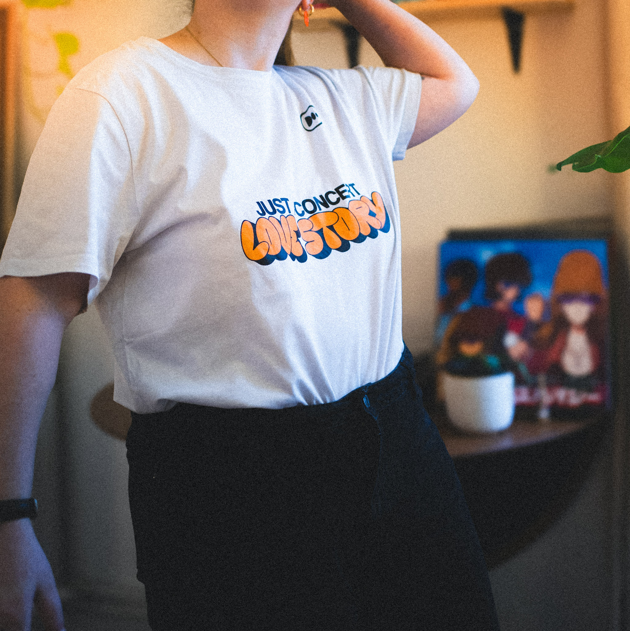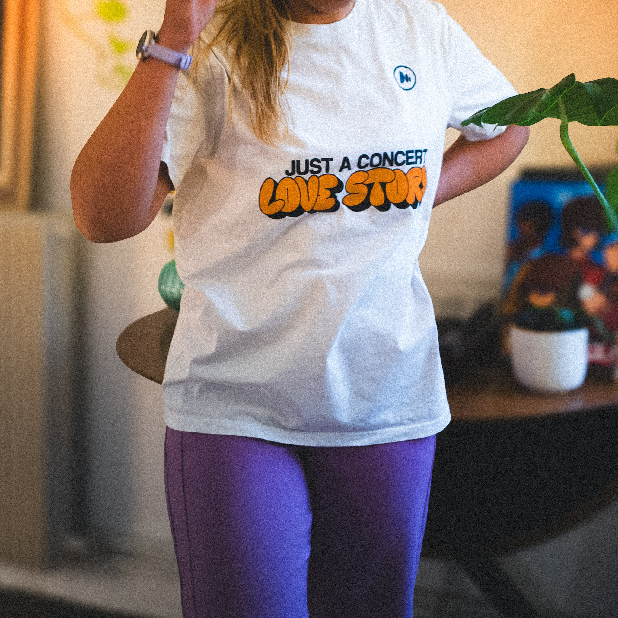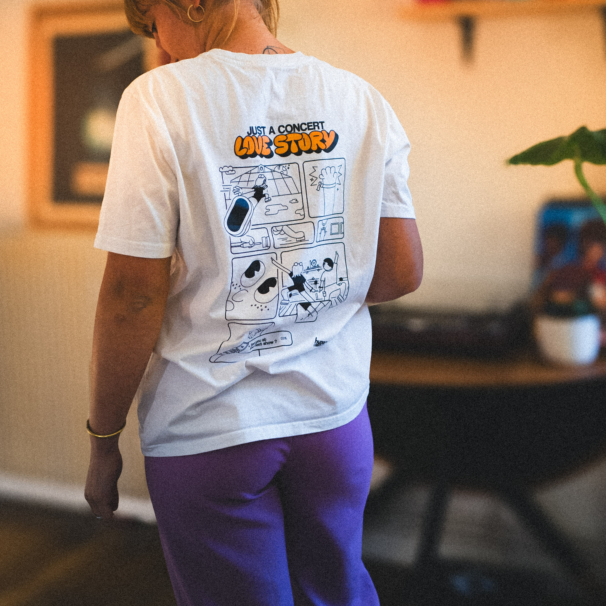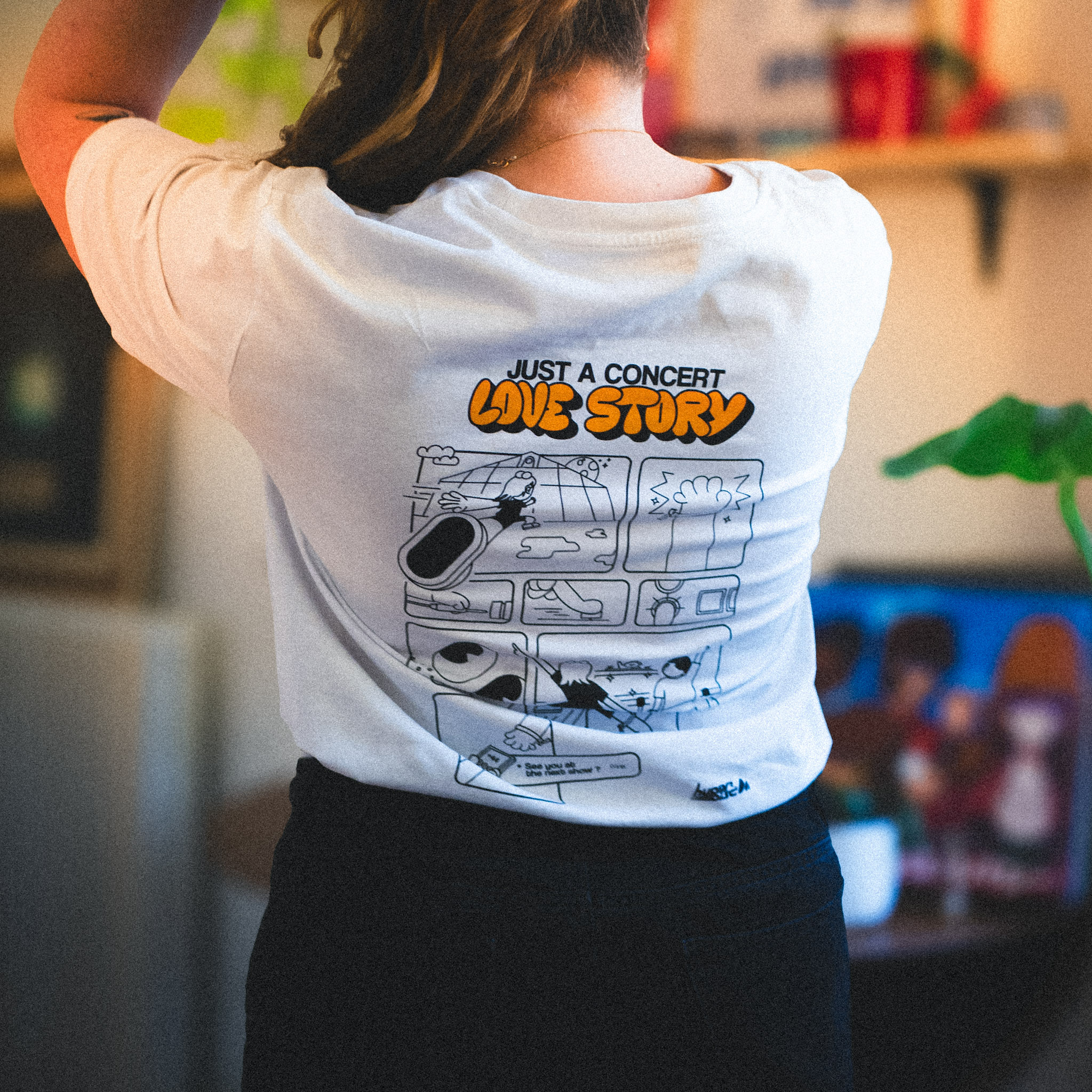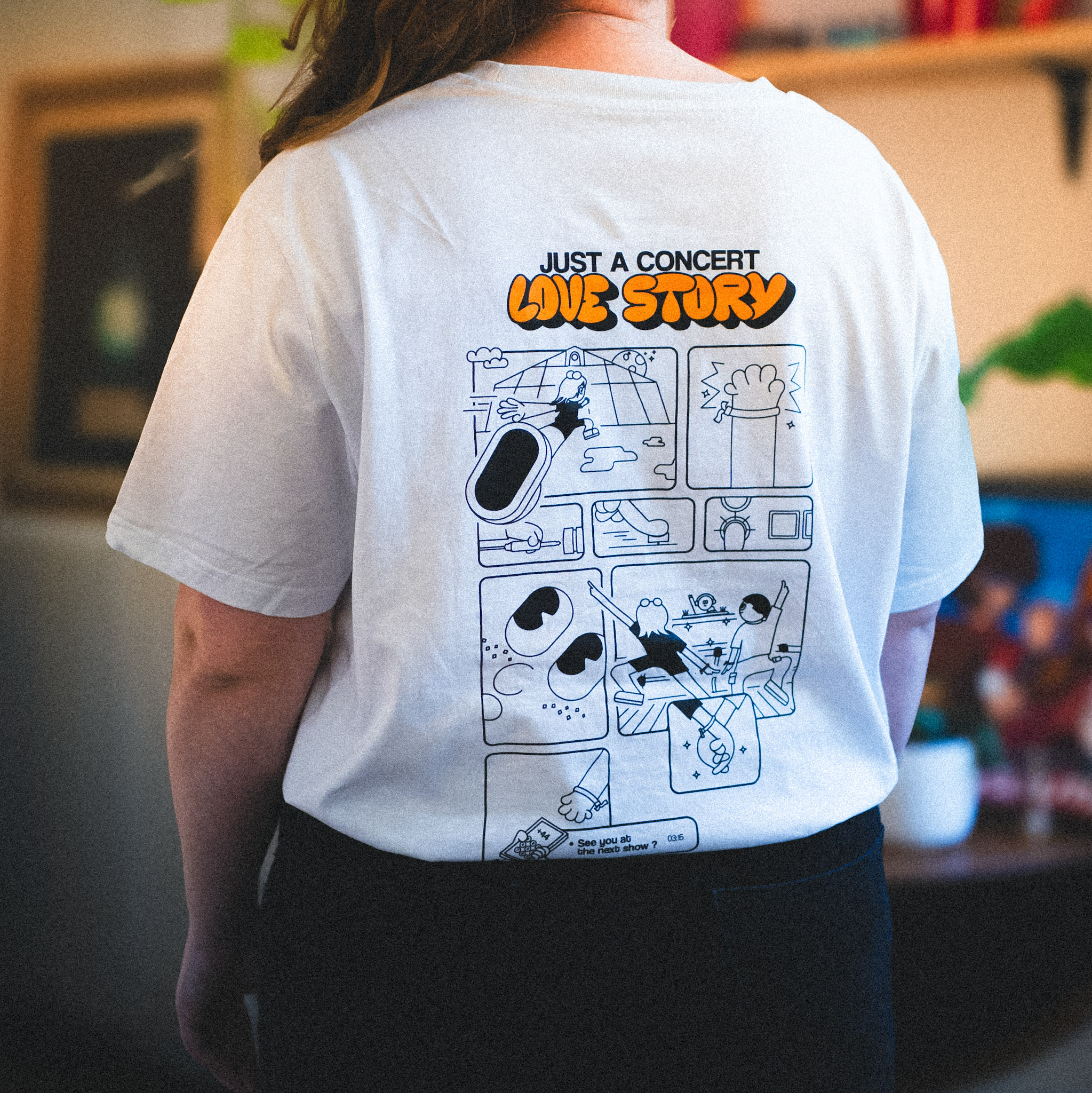 T-Shirt issu de la vidéo « Just a concert love story » disponible sur les réseaux de HyperDisc. 📦 Délais de livraison : la livraison peut prendre jusqu’à 2 semaines selon le volume de commandes que je reçois. Vous serez évidemment tenu informé par mail et sur les réseaux de HyperDisc, n’hésitez pas à me contacter !